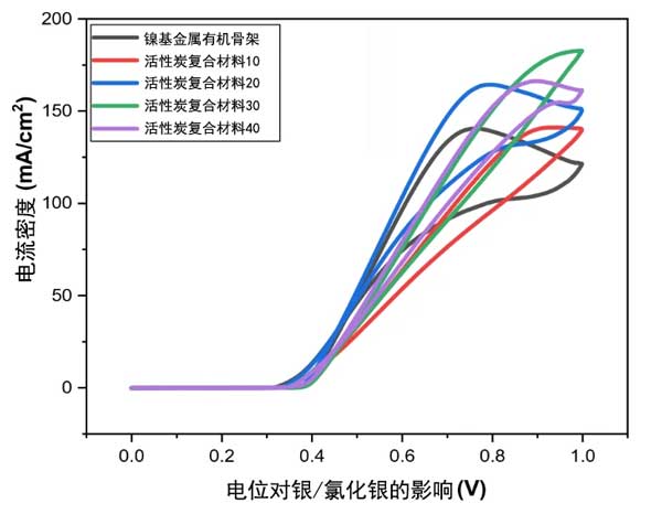 通過在KOH和CH3OH中氧化甲醇,使用循環(huán)伏安法測試活性炭復(fù)合材料的電化學(xué)性能。具有活性炭復(fù)合材料的鎳金屬對甲醇氧化反應(yīng)表現(xiàn)出更高的催化活性(見圖2)。在鎳金屬改性玻璃碳電極的情況下,峰值電流密度沒有添加活性炭的高。具有更高濃度活性炭(40mg)的樣品顯示出高峰值電流密度。隨著活性炭量(60mg)的進(jìn)一步增加,峰值電流密度降會(huì)稍微降低。綜上所述,建議將活性炭的濃度增加到一定限度可以提高電流密度。然而,增加活性炭的濃度也可能對催化活性產(chǎn)生不良后果。此外,活性炭復(fù)合材料的CV曲線具有不同的形狀和峰位置,這是因?yàn)楹铣蓵r(shí)活性炭分散不完全,也由于其大量使用導(dǎo)致催化劑發(fā)生簇集,導(dǎo)致覆蓋金屬有機(jī)框架表面,從而阻礙活性催化位點(diǎn)在低電位下進(jìn)行反應(yīng),從而在高電位下發(fā)生電荷轉(zhuǎn)移。