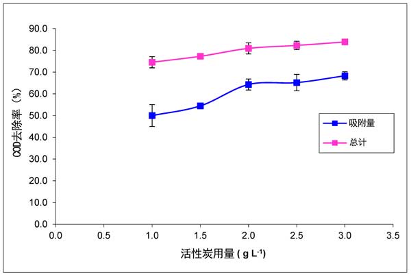 圖2顯示了在25℃、pH=7.5和170rpm的攪拌速率下,不同活性炭用量對(duì)COD去除的影響,持續(xù)24小時(shí)。我們測(cè)試了1.0、1.5、2.0、2.5和3.0g活性炭以確定合適吸附劑劑量。隨著活性炭濃度從1g增加到3g,觀察到COD去除率從50.0±5.1%和74.5±2.6%逐漸增加到吸附和總量的68.3±1.9%和83.9±1.0%。COD濃度從280.0±28.3略微下降至177.5±10.6mg。許多研究都報(bào)告說(shuō),隨著活性炭用量的增加,有機(jī)材料的去除率也會(huì)增加,這可以通過(guò)總比表面積和吸附劑上的活性位點(diǎn)來(lái)解釋。