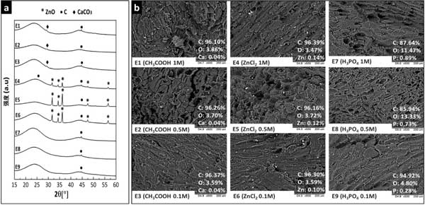 活性炭的X射線衍射圖如圖1-a所示。峰值在2θ=44在所有衍射圖中觀察到的6°歸因于對應(yīng)于石墨(00-001-0646)的(101)平面。與其他材料不同,活性炭的衍射圖也顯示在2θ=26.4°歸因于石墨(00-001-0646)的(002)平面。ZnO和CaCO3可能是在熱處理過程中作為原材料組分和活化劑之間二次化學(xué)反應(yīng)的產(chǎn)物或由于前體中固有的殘留礦物質(zhì)含量而產(chǎn)生的。經(jīng)過掃描電鏡分析500倍的SEM顯微照片如圖1-b所示。觀察到所有活性炭都表現(xiàn)出異質(zhì)表面形態(tài),其由不規(guī)則形式的成組薄片組成。在用ZnCl2活化的碳的表面上觀察到與氧化鋅相對應(yīng)的沒有特定形狀的白色小顆粒(通過XRPD分析證實)。此外,EDS分析顯示存在分散在整個表面的碳(C)、氧(O)和鋅(Zn),從而證實了ZnO顆粒分散在這些吸附劑的表面上。