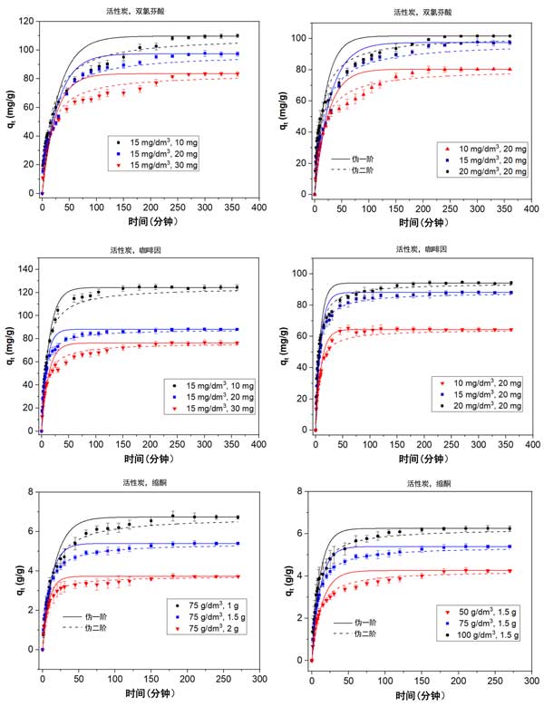 圖1:使用不同吸收濃度和活性炭用量對活性炭上雙氯芬酸、咖啡因和縮酮的動(dòng)力學(xué)吸附數(shù)據(jù)。