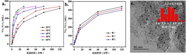 圖3:(a)在不同反應(yīng)溫度下由活性炭載鈀催化的總體積(H2+CO2)生成和(b)甲酸分解的穩(wěn)定性測(cè)試。(c)回收的活性炭催化劑TEM顯微照片和粒度分布。