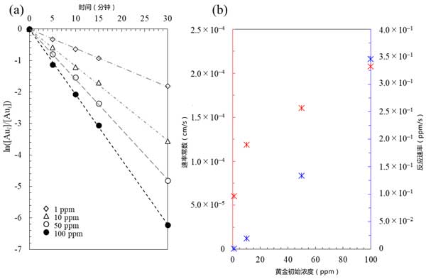 圖1:(a)初始金濃度對(duì)金離子回收率的影響,和(b)通過鋁和活性炭在銨中的電流相互作用進(jìn)行的膠合反應(yīng)的速率常數(shù)/反應(yīng)速率與初始金濃度的關(guān)系圖硫代硫酸鹽體系(注意反應(yīng)速率為負(fù)值)。