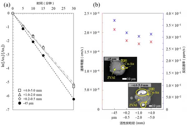 圖2:(a)活性炭尺寸對(duì)金離子回收率的影響,以及(b)鋁和活性炭在硫代硫酸銨體系中通過電偶相互作用進(jìn)行的膠合反應(yīng)的速率常數(shù)/速率與活性炭尺寸的關(guān)系圖(注意,反應(yīng)速率為負(fù)值)。