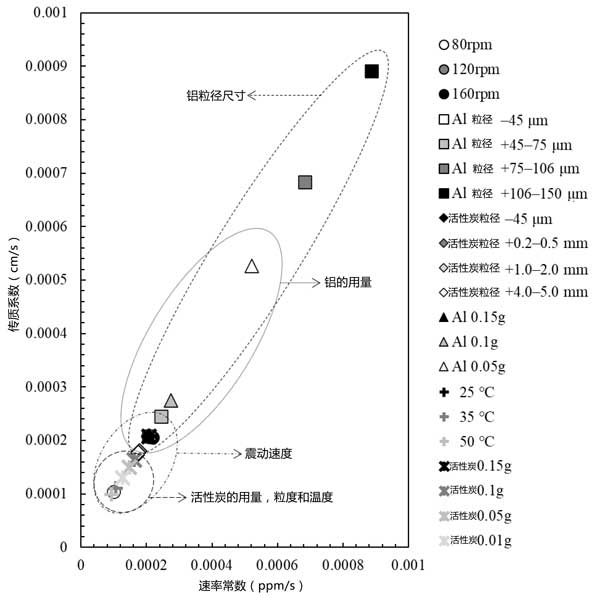 圖3:基于本研究中所有黃金回收結(jié)果的速率常數(shù)和傳質(zhì)系數(shù)圖。