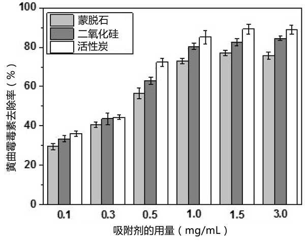 三種吸附劑對(duì)AFB1的吸附在25℃下進(jìn)行24小時(shí)。圖1顯示了活性炭和其它吸附劑用量的AFB1去除率。無(wú)論吸附劑劑量如何,使用活性炭時(shí)去除率更高,其次是二氧化硅和天然蒙脫石。正如預(yù)期的那樣,AFB1的去除率隨著吸附劑劑量的增加而增加,這可以通過(guò)AFB1與吸附劑之間的相互作用增加來(lái)解釋?zhuān)滏I、孔填充和靜電吸引力。吸附劑量為1.0mg/mL時(shí),黃曲霉毒素的去除率使用蒙脫石、二氧化硅和活性炭時(shí),分別為73.23%、80.35%和85.09%。在較高的吸附劑量(1.5mg/mL)下,去除率分別略微增加至75.56%、83.48%和89.15%。在這個(gè)吸附系統(tǒng)中,當(dāng)吸附劑以較低濃度使用時(shí),可用的吸附位點(diǎn)較少。因此,增加吸附劑濃度有效地增加了吸附位點(diǎn)的數(shù)量,從而提高了AFB1的去除率。但濃度過(guò)高時(shí),吸附劑顆粒間會(huì)發(fā)生膠結(jié)、絮凝和團(tuán)聚現(xiàn)象。這導(dǎo)致可用吸附位點(diǎn)的數(shù)量穩(wěn)定或減少,并且去除率沒(méi)有進(jìn)一步提高。此外,當(dāng)吸收劑以高濃度使用時(shí),可能會(huì)消除維生素E和甾醇等微量營(yíng)養(yǎng)素,從而導(dǎo)致?tīng)I(yíng)養(yǎng)流失。因此,使用濃度為1.0mg/mL的吸附劑被認(rèn)為是合適的,因此在進(jìn)一步的實(shí)驗(yàn)中被采用。
