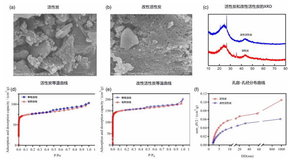 當(dāng)原活性炭經(jīng)受0.1mol/L、0.5mol/L和0.8mol/L高錳酸鹽,煅燒溫度為400℃、500℃、800℃,煅燒時間為2小時,5小時和7小時。通過三因素三水平正交試驗和極差分析篩選出改性活性炭的合適組合。改性后觀察到活性炭表面形態(tài)發(fā)生顯著變化,分別如圖1(b)所示。改性前的活性炭表面有較大的團聚顆粒,表面沒有明顯的孔隙結(jié)構(gòu)。改性后表面粗糙,呈不規(guī)則凸起的刺狀顆粒結(jié)構(gòu),孔隙結(jié)構(gòu)發(fā)達(dá)。改性前后活性炭的XRD圖如圖1(c)所示;钚蕴扛男郧昂蟮姆逍蜗嗨疲恍┓宄霈F(xiàn),另一些峰消失。圖1(d)和1(e)分別顯示了活性炭改性前后的吸附和解吸等溫線。它們整體呈隨P/P0增加的趨勢,吸附量增加,但在相同情況下,改性活性炭的吸附能力更強。圖1(f)為改性前后活性炭的孔容孔徑分布,改性后的活性炭孔體積更大。改性活性炭的比表面積是活性炭的兩倍,累積吸附總孔體積是活性炭的1.72倍。