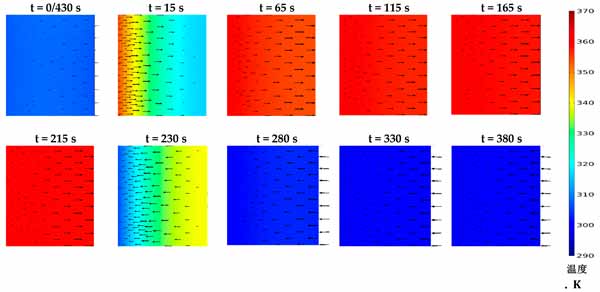 活性炭復(fù)合吸附劑的壓力和溫度決定了平衡吸收,它代表了在給定時(shí)間分別在吸附和解吸階段可以達(dá)到的最大和最小吸收容量。然而,顆粒內(nèi)和顆粒間的傳質(zhì)阻力表明吸附材料在每種給定情況下可以多快達(dá)到其平衡吸收能力。這突出了在本研究中同時(shí)求解兩種傳質(zhì)機(jī)制與其他控制方程的重要性,以顯示促進(jìn)傳熱對傳質(zhì)的凈效應(yīng)。圖2顯示了在430秒循環(huán)時(shí)間內(nèi),考慮到預(yù)熱和預(yù)冷階段均為30秒的時(shí)間間隔內(nèi)代表性部分的固結(jié)吸附劑域的溫度分布。