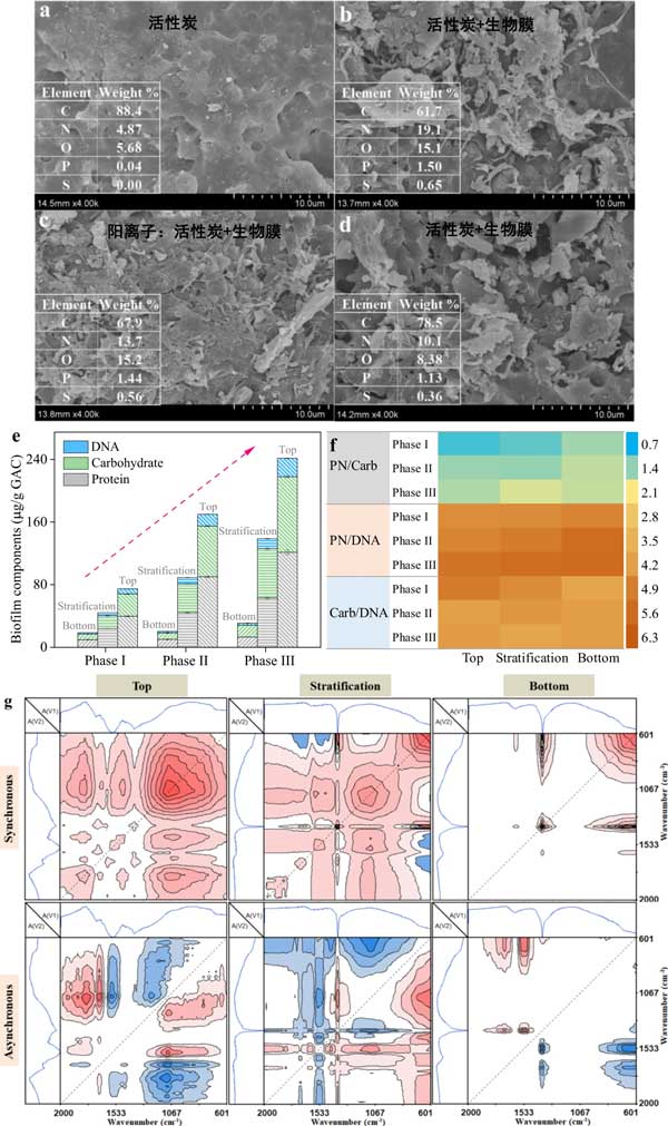 活性炭是生物膜生長(zhǎng)的優(yōu)良載體,它可以快速?gòu)囊合嘀形沼袡C(jī)物和營(yíng)養(yǎng)物質(zhì),用于生物膜中微生物的新陳代謝。圖1顯示了有和沒(méi)有生物膜的活性炭形態(tài)動(dòng)力學(xué)、生物膜組分的濃度和反應(yīng)器不同位置的官能團(tuán)。活性炭中的元素主要包括碳(C,88.4%)、氮(N,4.87%)、氧(O,5.68%),以及少量的磷(P,0.04%),活性炭表面為比較順利。生物膜形成后,活性炭表面附著大量生物質(zhì),變得更加粗糙。由于生物膜中蛋白質(zhì)、碳水化合物和DNA的積累,包括N、O和P在內(nèi)的主要元素的比例顯著增加(圖1e)。值得注意的是,硫元素也被檢測(cè)到,這應(yīng)該有助于活性炭和生物膜對(duì)LAS(磺酸基團(tuán))的吸附。