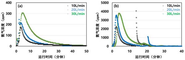 圖3:解吸流速對1000ppm濃度下(a)40ppm和(b)100℃在活性炭上吸附的影響。