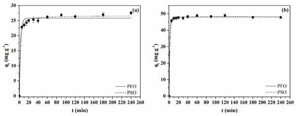 研究了初始吸附物濃度為50mgL-1和pH4的兩種活性炭的亮藍(lán)染料染料吸附動(dòng)力學(xué)行為。作為時(shí)間函數(shù)的吸附容量曲線分別如圖3a、b所示,分別為活性炭1和2?梢杂^察到活性炭2獲得的曲線的特征在于更快的吸附速率。活性炭2在大約10分鐘內(nèi)達(dá)到平衡。對(duì)于活性炭1,在大約60分鐘內(nèi)達(dá)到平衡。由于活性炭1呈現(xiàn)的較高總孔體積,可以解釋這種行為。高孔體積可以通過(guò)允許染料分子在孔內(nèi)更快地?cái)U(kuò)散到吸附位點(diǎn)來(lái)增強(qiáng)吸附動(dòng)力學(xué)。