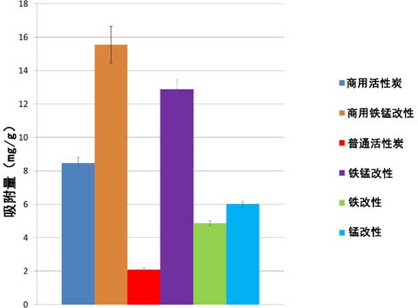 為了比較各種活性炭吸附砷(V)的效果,將0.1克活性炭添加到50mL/50ppm砷(V)樣品中。將樣品以150rpm攪拌6小時(shí),然后過(guò)濾,然后對(duì)濾液進(jìn)行元素分析。為了比較不同活性炭基質(zhì)的功效,以每克活性炭吸附的砷(V)毫克數(shù)(mg/g)來(lái)比較相對(duì)于添加的活性炭量的吸附。如圖所示數(shù)字圖1,與鐵、錳和鐵/錳一起官能化后,砷的吸附有顯著改善。