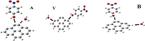 如上所述,為了啟動對復(fù)合物優(yōu)化結(jié)構(gòu)的系統(tǒng)搜索,硝基苯酚和水分子均以選定的方向放置在距活性炭表面3Å的位置,覆蓋主體周圍的整個物理空間。兩個分子被設(shè)計為從不同的相對方向相互接近:(1)兩者都從本體的同一側(cè)進(jìn)行攻擊(A-初始構(gòu)型),(2)攻擊來自本體的相對側(cè)(V-初始構(gòu)型),(3)兩個分子遵循垂直路徑(B-初始構(gòu)型)。這三種方法如圖2所示。選定的初始構(gòu)型AB區(qū)分通過化學(xué)吸附或通過物理吸附連接的復(fù)雜結(jié)構(gòu)的形成。配置A有利于物理吸附,而配置V和B分別有利于完全和部分化學(xué)吸附。