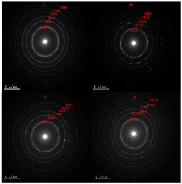 圖2:通過電子衍射HRTEM獲得的合成(a)BiOI、(b)1C/BiOI、(c)5C/BiOI和(d)10C/BiOI納米復(fù)合材料的SAED圖像。