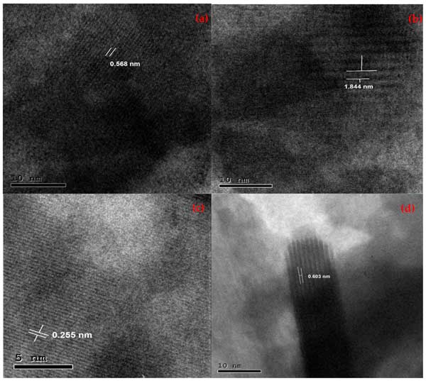 圖3:合成的(a)BiOI、(b)1C/BiOI、(c)5C/BiOI和(d)10C/BiOI納米復(fù)合材料的HRTEM d間距。