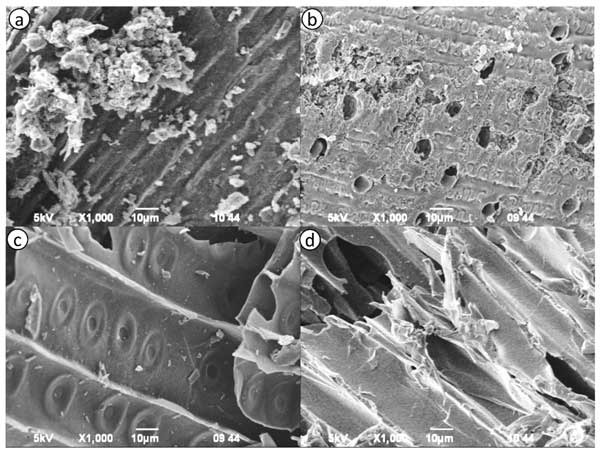 圖1a-d顯示了來自不同植物來源的活性炭樣品的形貌SEM圖像。圖像突出顯示了樣品表面結(jié)構(gòu)和孔隙率的明顯差異。圖1a顯示了粗糙的表面,表面具有高密度的不規(guī)則、未受干擾的顆粒。大量裂紋和裂縫的存在表明多孔結(jié)構(gòu)發(fā)達(dá)。圖1b顯示出類似的多孔形貌,具有廣泛的薄膜狀結(jié)構(gòu)和大空隙,表明活化和孔隙形成效率高。