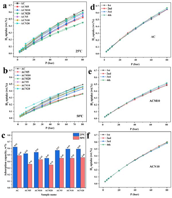 氫氣儲(chǔ)存材料在實(shí)際應(yīng)用中需要具備良好的循環(huán)性能。作者對(duì)AC、ACM10、ACN10等樣本進(jìn)行了若干次(例如10次或更多)吸附–解吸循環(huán)測(cè)試,以評(píng)估其穩(wěn)定性。原文圖2d、5e、5f展示了循環(huán)曲線。