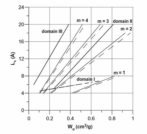 活性炭孔隙率遵循三個(gè)線性結(jié)構(gòu)域所示的常見趨勢(shì)。這一事實(shí)表明存在著由不同前體和精制路線的固體部分共同形成的共同形態(tài)。根據(jù)這些多孔固體的近期和各種已發(fā)表的特征,它們的孔壁由基本結(jié)構(gòu)單元的空間排列構(gòu)成,所述基本結(jié)構(gòu)單元由層疊的石墨烯層組成。為了減少模型中的參數(shù)數(shù)量,結(jié)構(gòu)被描述為圓盤狀顆粒,其直徑的特征在于石墨烯層中涉及的苯環(huán)的數(shù)量,并且其厚度由堆疊層的數(shù)量和層間距離。用于工業(yè)宏觀尺寸盤狀顆粒堆積的可用經(jīng)驗(yàn)相關(guān)性已經(jīng)應(yīng)用于那些納米級(jí)結(jié)構(gòu),導(dǎo)致在chars和碳分子篩觀察到的實(shí)驗(yàn)微孔體積范圍內(nèi)的值。