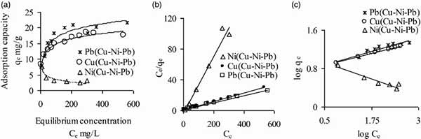 圖2.初始pH值為5的活性炭的三元溶質(zhì),Cu(II),Ni(II)和Pb(II)的Langmuir非線性(a),線性(b)和Freundlich(c)等溫線而它們的初始濃度變化,從<0到≤600mg L-1。(分析Ni樣品的濃度范圍高達(dá)305mg L -1)。