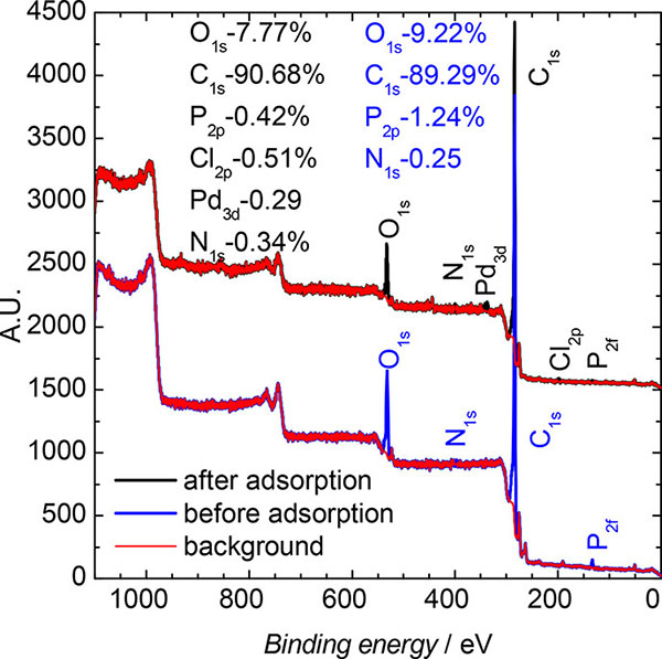 吸附過程之前和之后材料的完整XPS光譜如圖2所示。考慮到觀察到的溶液中Pd(II)濃度的降低,估計(jì)鈀負(fù)載等于0.7%(m/m)?梢钥闯鰜碜遭Z的峰出現(xiàn)。對這個(gè)峰值進(jìn)行更深入的分析可以為我們提供有關(guān)鈀電子結(jié)構(gòu)的信息。