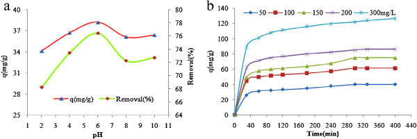 圖4、pH值(a)在濃度=50 mg/L和接觸時(shí)間(b)對濃度=50-300 mg/L的影響,苯胺吸附在活性炭上,W=1 g/L T=20℃。