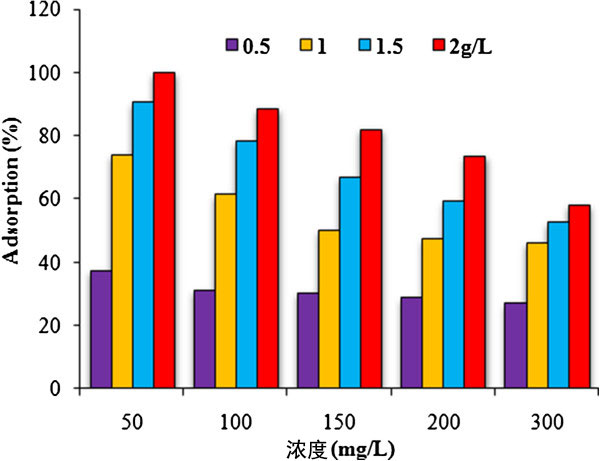 圖5、各種苯胺濃度對其在活性炭上的吸附的影響:pH=6,t=300min,濃度 = 50-300mg/L,W=0.5-2g/L和T=20℃。