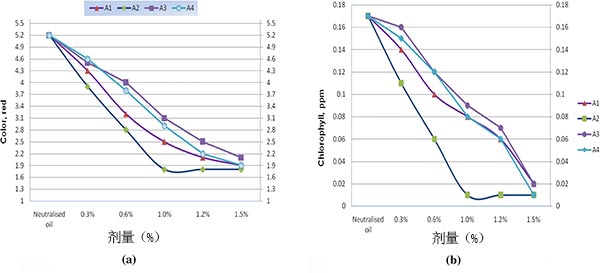 吸附劑的量是漂白過程中最重要的因素。圖3中所示的吸附劑用量的幾種活性炭和漂白土的效果。結(jié)果清楚地表明,活性炭樣品A2在1%吸附劑用量下達(dá)到最佳值,吸附劑用量的進(jìn)一步增加對其沒有顯著影響。這可以通過吸附平衡在吸附劑/油混合物之間達(dá)到最大值的事實來解釋。然而,通過在漂白過程中增加其它吸附劑A1,A3和A4的數(shù)量來增加顏色吸收,并且1.5%地球樣品A4顯示與1%活性炭樣品A2相同的結(jié)果。圖3b顯示當(dāng)使用漂白土和活性炭漂白葵花籽油時劑量對葉綠素減少的影響。該圖還表明吸附劑A2對顏色去除的影響比其它的更為有效。