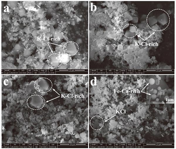 圖4顯示了煙氣通過活性炭之前和之后的化學(xué)組成?梢园l(fā)現(xiàn)PM 2.5中的+ Fe,Ca,Si,Al和Mg的含量在煙氣通過活性床時比基礎(chǔ)情況下都有所增加,而K,Na,Pb的含量, PM 2.5中的 Zn和Cl都出現(xiàn)了下降。圖5給出了煙氣經(jīng)過活性炭層后在過濾器中收集的PM 2.5的SEM圖像,觀察到經(jīng)活性炭去除后,較大顆粒的數(shù)量主要由K和Cl組成減少(圖5)(b)-5(d))與基本情況比較(圖5(a))雖然有許多較小的顆粒,如球形顆粒(圖5(d)),主要包含F(xiàn)e和Ca這種現(xiàn)象與PM 2.5的化學(xué)成分變化非常一致。此外,與使用厚度為200毫米,粒度為8-12毫米的活性炭床的情況相比(圖5(b)),出現(xiàn)了較少的大的富含K-Cl的顆粒,并且出現(xiàn)了許多較小的球形富含F(xiàn)e-Ca的顆粒。