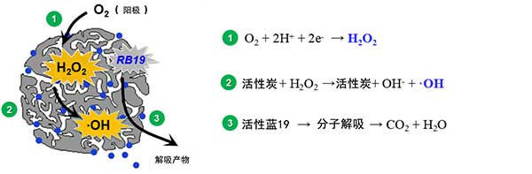 該方法的關(guān)鍵特征之一是沒有氧化劑或催化劑外部添加到系統(tǒng)中。過氧化氫電生成和OH生成都發(fā)生在負(fù)極化的活性炭上。因此,RB19分子,過氧化氫分子和OH自由基處于相同位置(活性炭的孔隙和表面),這有利于短壽命OH的RB19裂解。擴大此流程的關(guān)鍵是活性炭與當(dāng)前不銹鋼網(wǎng)保持良好可靠的聯(lián)系。這種方法可以將吸附于活性炭內(nèi)的分子去除,再生活性炭的吸附能力,是一種比較好的活性炭再生方法。
