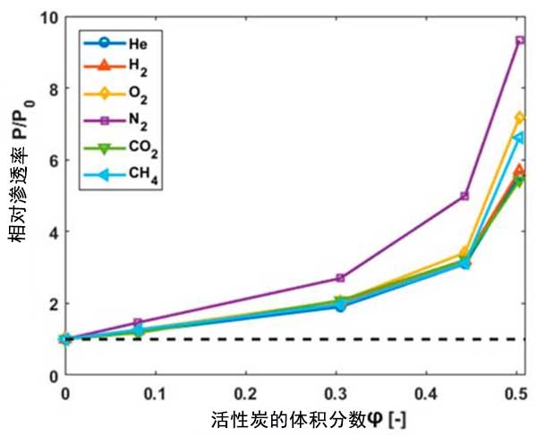 圖2:活性炭膜的滲透率與聚合物膜的滲透率之比作為活性炭體積分?jǐn)?shù)的函數(shù)。