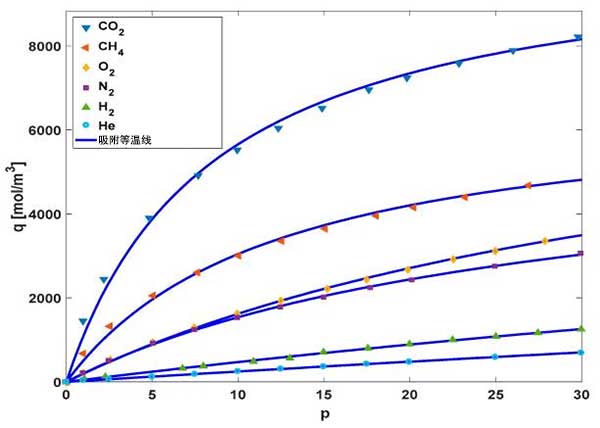 圖3:活性炭在不同氣體在壓力下的濃度和在30℃下的相應(yīng)吸附等溫線。