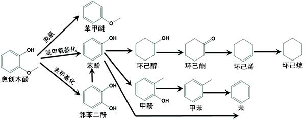 圖2:愈創(chuàng)木酚通過(guò)活性炭載鎳催化劑的加氫脫氧反應(yīng)。