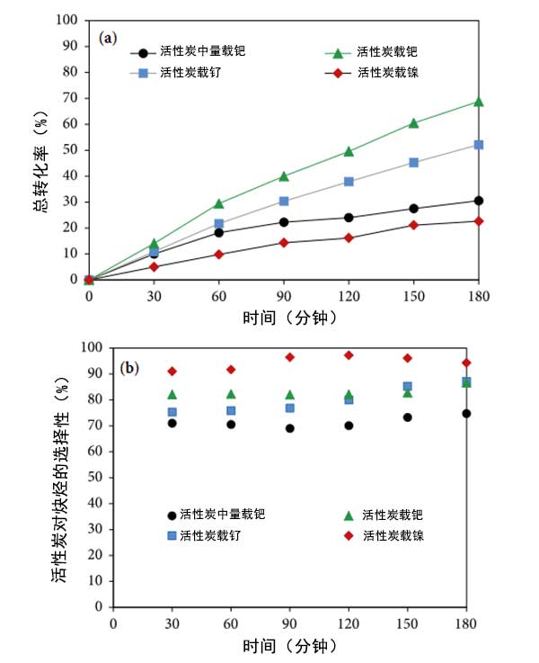 活性炭催化劑對炔烴的選擇性氫化的催化性能如圖3所示,炔烴總轉(zhuǎn)化率(%)和對炔烴的選擇性。所有活性炭載金屬催化劑在炔烴的氫化過程中都是活性的,并且對炔烴(所需產(chǎn)物)具有高選擇性。