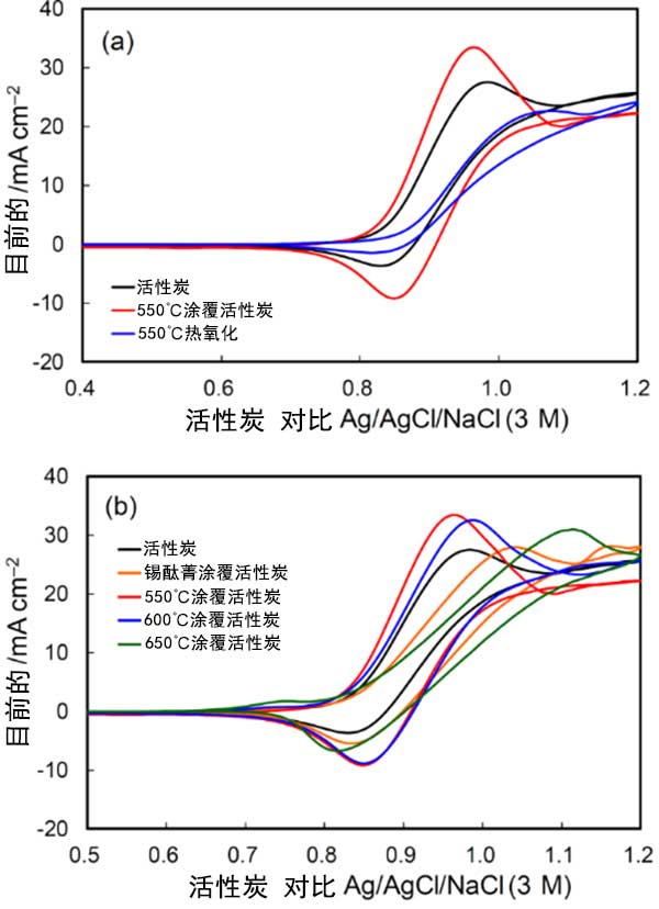 在沒有釩離子的酸性電解質(zhì)中獲得的循環(huán)伏安圖顯示在圖3中。伏安圖中的電流由三個組分組成,即活性炭-電解質(zhì)界面處的電化學雙層充電電流,以及由于表面官能團的氧化還原反應(yīng)和活性炭表面氧化引起的法拉第電流。電化學雙層充電產(chǎn)生恒定電流和矩形CV形狀。電流取決于基面和邊緣平面的曝光程度,在0.5V附近的寬氧化還原峰和0.8V以上的氧化電流分別歸因于醌/氫醌樣表面官能團的氧化還原反應(yīng)和活性炭表面氧化。這些電流在熱氧化后增加,并且在錫酞菁涂覆活性炭的熱氧化期間隨著溫度的升高而增加。電化學雙層電流的增加歸因于邊緣平面的暴露,這與拉曼光譜一致。對于錫酞菁涂覆活性炭觀察到的活性炭表面氧化電流意味著高表面粗糙度的發(fā)展。