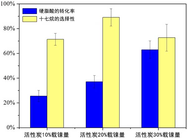 結(jié)果發(fā)現(xiàn)制備的活性炭載鎳催化劑并表現(xiàn)出優(yōu)異的脫羧活性和維持。硬脂酸可在370℃下完全轉(zhuǎn)化5小時(shí),對(duì)十七烷的選擇性約為80%。過量的鎳顆?赡軙(huì)阻塞一定量的活性炭孔隙并減少孔隙體積。隨著高鎳負(fù)載量或催化劑負(fù)載量,裂解產(chǎn)物增加。溫度顯著影響硬脂酸的轉(zhuǎn)化,但不影響選擇性。具有大碳數(shù)的脂肪酸在活性炭反應(yīng)體系中易于裂化。