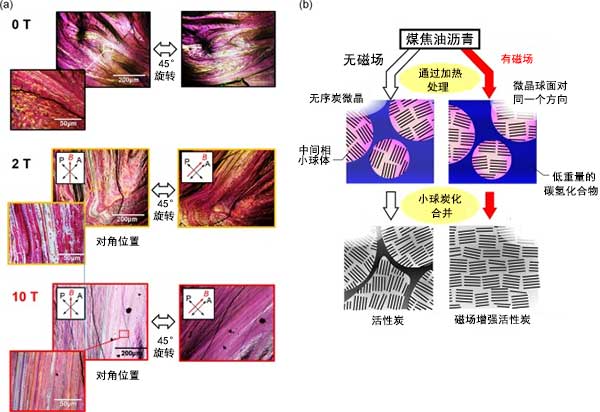 圖2:(a)在沒(méi)有和存在2T和10T的磁場(chǎng)的情況下制備的活性炭前體材料的偏振顯微鏡圖像。(b)對(duì)煤焦油瀝青的碳化過(guò)程的磁場(chǎng)效應(yīng)的示意圖。
