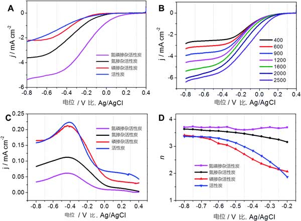 活性炭樣品通過兩步法制備,包括原位氧化聚合和高溫?zé)峤狻_@里,苯胺和植酸分別用作氮源和磷源。為了研究氮磷碳比對活性炭的氧化還原電催化活性的影響,在中性介質(zhì)中進行循環(huán)伏安圖。旋轉(zhuǎn)圓盤電極伏安圖在氧飽和的50mM磷酸鹽緩沖溶液中進行,結(jié)果顯示在圖2A中。在摻雜碳改性后,活性炭基催化劑的起始電位顯示出從0V到+0.22V的大的正向偏移,氧化還原電流密度也大大增加。此外,由共摻雜碳改性的活性炭電催化活性優(yōu)于由單摻雜碳改性的活性炭電催化活性。在進行旋轉(zhuǎn)環(huán)盤電極測量以研究不同催化劑的過氧化氫的產(chǎn)生(圖2C)。正如預(yù)期的那樣,氮磷摻雜活性炭顯示出比其他催化劑更低的過氧化氫產(chǎn)生?梢钥闯,氮磷摻雜活性炭在氧化還原起始電位和高電流電流方面對氧化還原具有優(yōu)異的電催化活性,突出了N,P共摻雜和中孔結(jié)構(gòu)對氧化還原的重要性。