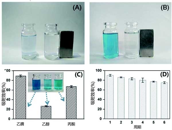活性炭的回收和再利用是在實際應用中需要考慮的關鍵因素。因此,我們調查了活性炭的恢復和可重用性。通過外部磁體很容易將活性炭與水溶液分離(圖3A和B)。通過使用乙腈,乙醇和丙酮作為洗脫液輔助超聲來再生裝載孔雀石綠的活性炭。乙腈的解吸效率優(yōu)于乙醇和丙酮,解吸效率分別為90.2%,35.7%和71.3%(見圖3C)。活性炭在解吸和再生后是穩(wěn)定的。此外,六個循環(huán)后沒有明顯的吸附效率損失(圖3D)。對活性炭的快速吸附,大吸附容量和良好的可重復使用性促使我們研究其實際應用。將活性炭分散在含有加標孔雀石綠(25mg L-1)的廢水中。在用外部磁體快速吸附和分離活性炭后獲得澄清的上清液(圖3A和B)。結果表明,活性炭是一種經(jīng)濟有效的高性能吸附劑,用于孔雀石綠吸附和去除廢水。