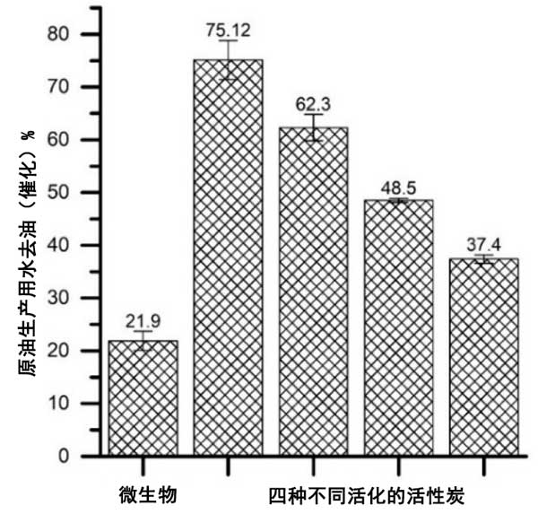 簡而言之,使用活性炭(60%-93%)和載微生物活性炭(16%-84%)比游離的無活性炭載體的微生物(1%-47%)更好地去除芳香烴。材料的孔隙率和吸附偶極性有利于吸附。常規(guī)活性炭表現(xiàn)出高度的微孔性,其中可以容納分子量約為100的苯,甲苯和苯酚;钚蕴康姆菢O性特征保證了碳氫化合物的疏水吸引力,也是非極性的;钚蕴筷栯x子表面有利于芳烴保留,因為芳環(huán)中的π電子與表面陽離子靜電連接。使用常規(guī)活性炭和載微生物活性炭的原油去除能力如圖3所示。使用游離的微生物和油-鹽水乳液作為對照。