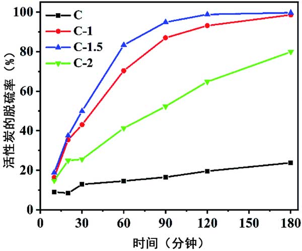 基于以上結(jié)構(gòu)表征和實(shí)驗(yàn)結(jié)果,得出了吸附機(jī)理。戊硫醇分子中的強(qiáng)路易斯酸S原子與活性炭中來自氧原子的一對電子相互作用。大孔和中孔的存在有助于活性炭的比表面積增加,暴露出更多的內(nèi)部原子,并促進(jìn)了質(zhì)量傳遞,從而使吸附劑易于與硫化物接觸。關(guān)于炭1.5的工業(yè)應(yīng)用前景,考慮了硫的初始濃度對吸附性能的影響。如圖3所示,對于初始含硫量分別為15、28、38和48 ppm的模型燃料,炭1.5的平衡吸附容量為每克吸附劑3.0、5.6、7.6和9.6 mgS。值得注意的是,在此濃度范圍內(nèi),吸附劑的硫去除率高于97%。這組結(jié)果表明該材料對于去除低濃度的硫化物具有明顯的工業(yè)應(yīng)用價(jià)值。