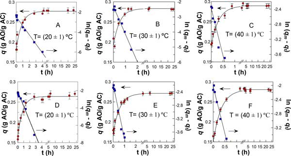 圖1顯示了典型的動力學(xué)圖,說明了沒食子酸和沒食子酸丙酯在平衡(q)時每質(zhì)量活性炭吸附的抗氧化劑的量隨時間的變化。還顯示了在不同溫度下至少三個半衰期(相關(guān)系數(shù)>0.99)的相應(yīng)一階圖。在所有情況下,吸附曲線均顯示在4h后達(dá)到平衡,并至少維持24h,這是后續(xù)研究的時間。