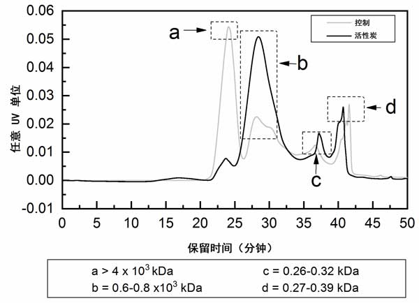 為了檢驗活性炭改變可溶性微生物組成,使其對膜具有更高的親和力這一假設(shè),通過GPC分析了構(gòu)成可溶性微生物的有機(jī)分子的大小分布(圖1)。在第二次可溶性微生物運(yùn)行結(jié)束時收集了可溶性微生物樣品(圖1b),有趣的是,GPC色譜圖顯示了對照反應(yīng)堆和活性炭加入反應(yīng)堆之間的明顯差異。在活性炭反應(yīng)器的可溶性微生物中,保留時間為24分鐘時,來自對照反應(yīng)器的可溶性微生物的第一個峰顯著降低,而在活性炭反應(yīng)器的可溶性微生物中,在28分鐘時觀察到峰的上升(圖1,分別是峰值a和b);钚蕴糠磻(yīng)器的可溶性微生物中的37分鐘處的峰也升高(峰c)。可溶性微生物中某些有機(jī)化合物含量的變化(升高或降低)可能歸因于,由于微生物群落組成的變化或某些活性炭所觀察到的代謝活性增強(qiáng),導(dǎo)致某些微生物產(chǎn)品的產(chǎn)生和分泌增加另外,或抑制進(jìn)水橄欖油廢水中物質(zhì)的降解。有機(jī)化合物對活性炭顆粒的吸附只會降低其在可溶性微生物中的外觀。由于吸附到活性炭上,可溶性微生物中某些成分的減少(如峰a所示)也有可能優(yōu)先吸附其他成分,這些成分對通量的減少更不利,或者起膜調(diào)節(jié)前體的作用,這可能會增強(qiáng)生物膜的生長(例如峰b–d)。顯然,確定膜上有機(jī)污染物的身份是一項必不可少的任務(wù),目前,尚不清楚不同可溶性微生物組分對膜污染的詳細(xì)影響以及它們被活性炭的吸附。