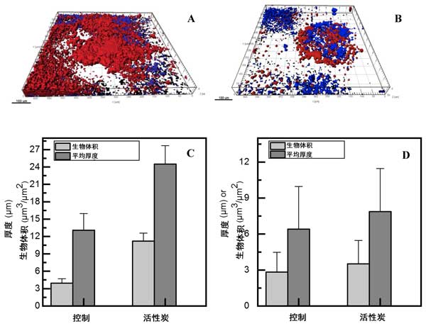 為了分析由于在膜生物反應(yīng)器中添加活性炭而導(dǎo)致生物膜形成增加的可能性,并進(jìn)一步闡明活性炭反應(yīng)器中膜性能下降幅度更大的原因,在第一個處理結(jié)束時進(jìn)行了檢測(圖2A,B)。在比較兩個反應(yīng)器之間生物膜結(jié)構(gòu)的性質(zhì)時,可以觀察到活性炭反應(yīng)器通量下降的增加顯然與生物膜生長的幅度有關(guān)。在第一次膜生物反應(yīng)器運(yùn)行結(jié)束時從模塊上獲取的兩塊膜上生物膜的CLSM分析顯示,活性炭和對照反應(yīng)器之間細(xì)胞的生物體積及其自相關(guān)EPS的差異很大(圖2)。當(dāng)補(bǔ)充活性炭時,生物膜生長的升高支持了膜滲透性的更高降低,這是由可溶性微生物組分吸附的升高引起的,這可能會更好地調(diào)節(jié)膜表面,從而增強(qiáng)生物膜的形成。