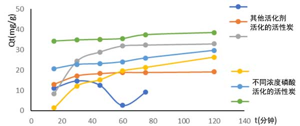活性炭的吸附時(shí)間影響可從圖1看出,活性炭吸附分三步進(jìn)行:第一是在最初的30分鐘內(nèi),污染物的吸附量很快就被確定了,這可以用在吸附劑的外表面存在大量空置的結(jié)合位點(diǎn),這使得吸附劑易于吸附到該表面。第二在31分鐘后,吸附速率降低,過程緩慢。活性炭的其他位置達(dá)到飽和后,污染物顆粒將遷移到吸附劑內(nèi)部。由于易于接近,因此吸附過程緩慢:顆粒內(nèi)擴(kuò)散。第三從80分鐘開始,我們觀察到一次接觸,活性炭已達(dá)到其最大容量。我們可以說這些吸附劑的平衡時(shí)間是80分鐘。然而,磷酸活化的活性炭吸附量的演化曲線顯示,在最初的30分鐘內(nèi),污染物的吸附量顯著增加,此后,污染物的吸附量急劇下降,這將是一種產(chǎn)物解吸。這一現(xiàn)象在其他吸附劑中是不可見的,這可能意味著可用孔隙的數(shù)量和結(jié)合力隨著所用活化劑濃度的增加而增加,這一點(diǎn)還通過碘值和亞甲基藍(lán)的值進(jìn)行了驗(yàn)證。