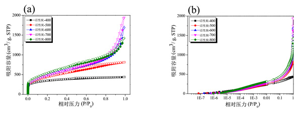 圖1:活性炭的等溫線吸附-解吸曲線隨各種磷酸活化溫度的變化(a)正常和(b)對數(shù)。