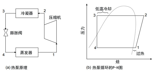 熱泵是空調(diào)的熱力學(xué)原理,可以基于狀態(tài)點(diǎn)的熱物理特性來預(yù)測(cè)熱泵的熱力學(xué)性能。圖2(a)顯示了典型熱泵的示意圖,圖2(b)顯示了壓力-焓線圖上的熱泵循環(huán)。在我們的模擬中,不僅計(jì)算了每種狀態(tài)下的熱物理性質(zhì),而且還計(jì)算了蒸發(fā)器和冷凝器中的熱交換過程。由于換熱器規(guī)格的可用性限制,所以將換熱器建模為雙管逆流式換熱器,該換熱器用于我們的實(shí)驗(yàn)裝置中。
